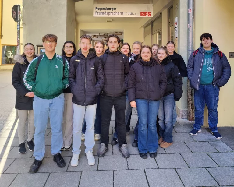 Am 27.03.2026, dem letzten Schultag vor den Osterferien, durfte die Klasse 9d der Realschule Neutraubling (Französischzweig) mit ihren 16 Schülerinnen und Schülern die Regensburger Fremdsprachenschule besuchen. Gleich zu Beginn wurden alle von Schulleiterin Fanella Raab herzlich empfangen – inklusive eines kleinen Schoko-Osterhasen als freundliche Aufmerksamkeit.