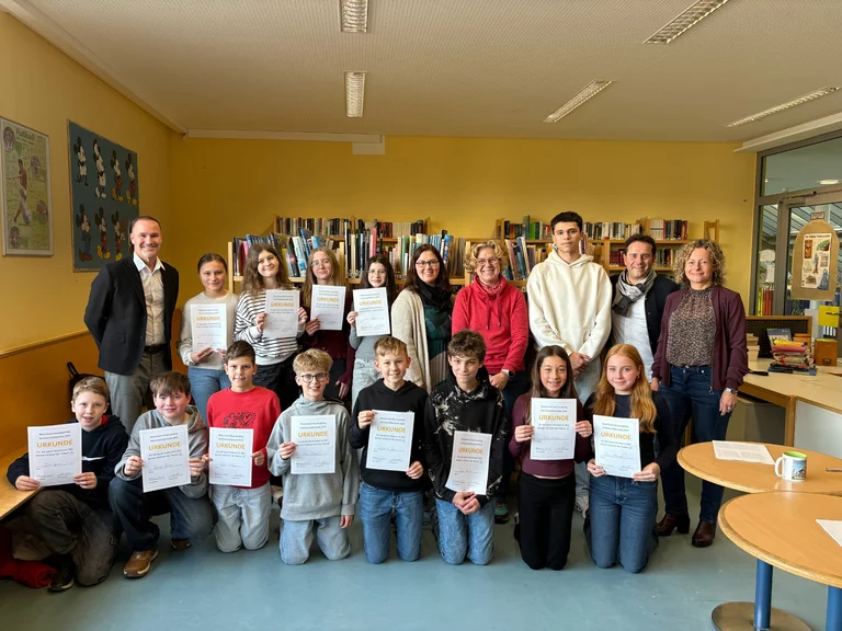 Die „Ethischen Glühbirnen“, bestehend aus den Schülerinnen und Schülern der Ethik-Gruppe (6. Jahrgangsstufe) von Lehrerin Claudia Umlauf, sind mächtig stolz auf ihre Urkunden vom Bundesentwicklungsamt mit der persönlichen Unterschrift von Entwicklungsministerin Reem Alabali Radovan.