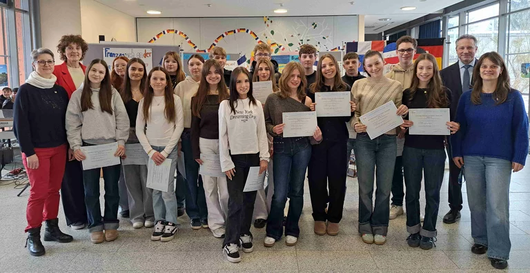 Höhepunkt der Feier war die Verleihung der DELF-A2-Diplome des Institut Français an die Schülerinnen und Schüler der Klasse 10d. Die besten Leistungen erzielten hierbei Theresa Koller (1.), Nina Diermeier (2.) und Lilly Röhrl (3.). Félicitations!