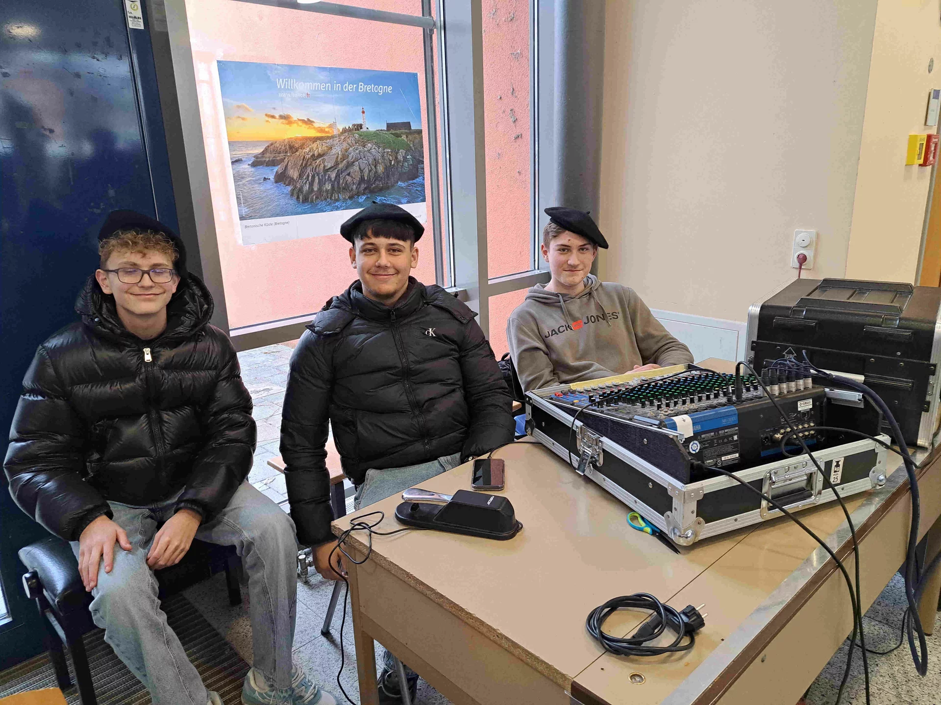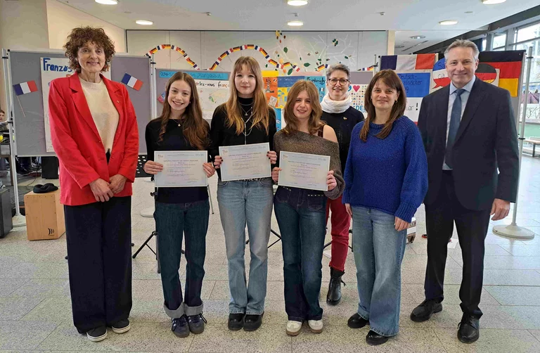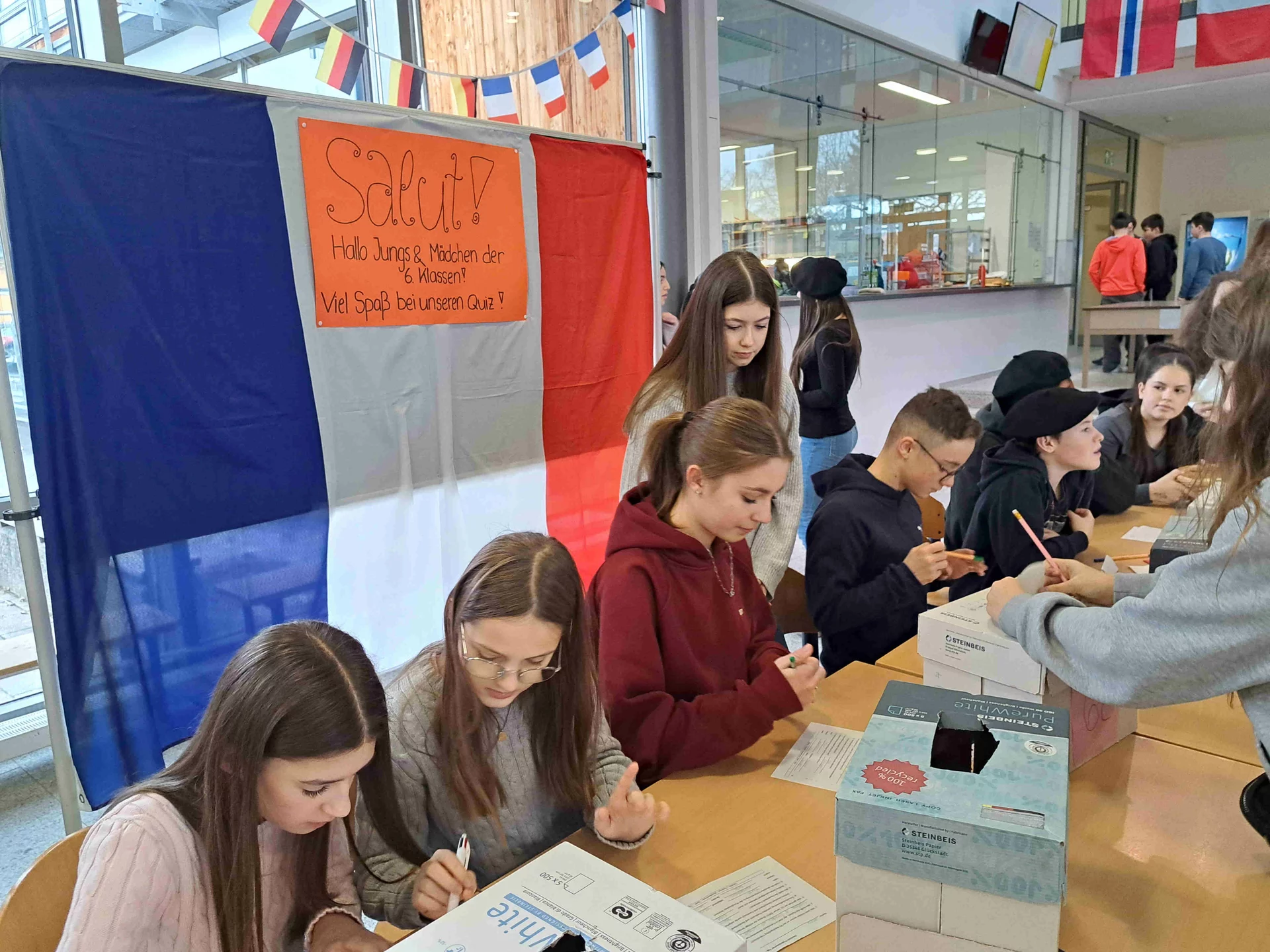 Eine eigens gegründete Band, bestehend aus drei gesangsstarken Leadsängern sowie Musikern an Akkordeon, Gitarre, Saxophon, Klavier und Cajon, performte zusammen mit den Französisch-Klassen 7e, 8e, 9d und 10d französische Lieder in der Aula und sorgte so für einen festlichen Rahmen. Schulleiter Andreas Gruber begrüßte alle Anwesenden und bedankte sich bei den drei Französischlehrerinnen Anna Schafbauer, Katharina Funk und Bettina Thaler für die gelungene Organisation dieses Festtages, der seit 2004 in allen deutschen und französischen schulischen Einrichtungen in Erinnerung an die Unterzeichnung des deutsch-französischen Freundschaftsvertrags am 22. Januar 1963 gefeiert wird. In der mit vielen französischen Details dekorierten Aula konnten sich zunächst alle 6. Klassen an Schautafeln über die Kultur des Nachbarlandes und die Geschichte der deutsch-französischen Freundschaft informieren und dabei an einem Quiz mit Preisverleihung teilnehmen. Auch die zahlreichen schulischen Aktionen zum kulturellen Austausch mit Frankreich wurden in der Ausstellung aufgezeigt. Begleitet von französischer Musik, zusammengestellt durch Schüler der Klasse 10d, erhielten die Sechstklässler einen guten Einblick in den im Folgejahr startenden Französisch-Zweig.
