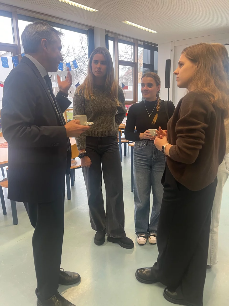 Um einen authentischen Einblick in den Schulalltag zu gewinnen, hospitierten die tschechischen Gäste im Anschluss im Unterricht der Fächer Deutsch und Englisch. Hier konnten sie die pädagogische Arbeit live miterleben und direkt mit unseren Schülerinnen und Schülern sowie Lehrkräften in Kontakt treten. Den Abschluss des Vormittags bildete eine rege und offene Gesprächsrunde unterstützt durch unser Tschechisch Lehrkraft Frau Miroslava Putz. Hier nutzten die tschechischen Gäste die Gelegenheit, ihre Eindrücke aus den Unterrichtsbesuchen zu schildern und gezielte Fragen zu stellen. Im Dialog mit der Schulleitung und den beteiligten Lehrkräften entwickelte sich ein fruchtbarer Austausch über pädagogische Ansätze, die Herausforderungen und Chancen digitaler Bildung sowie die Unterschiede und Gemeinsamkeiten im deutschen und tschechischen Schulalltag. Die positive und konstruktive Atmosphäre unterstrich das gemeinsame Interesse an einer modernen und schülerzentrierten Pädagogik.
