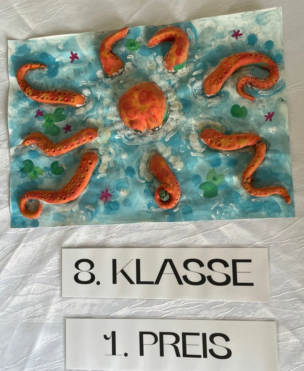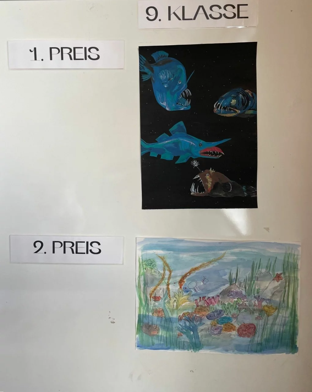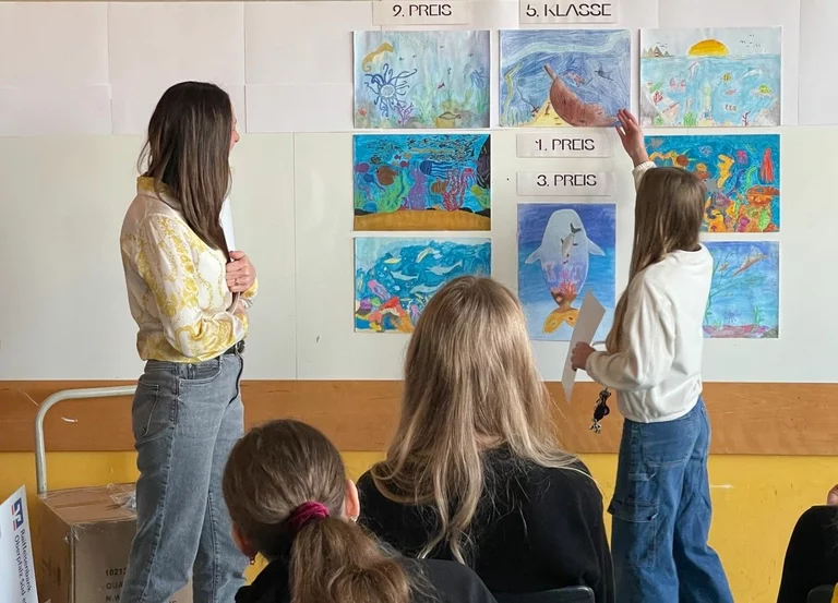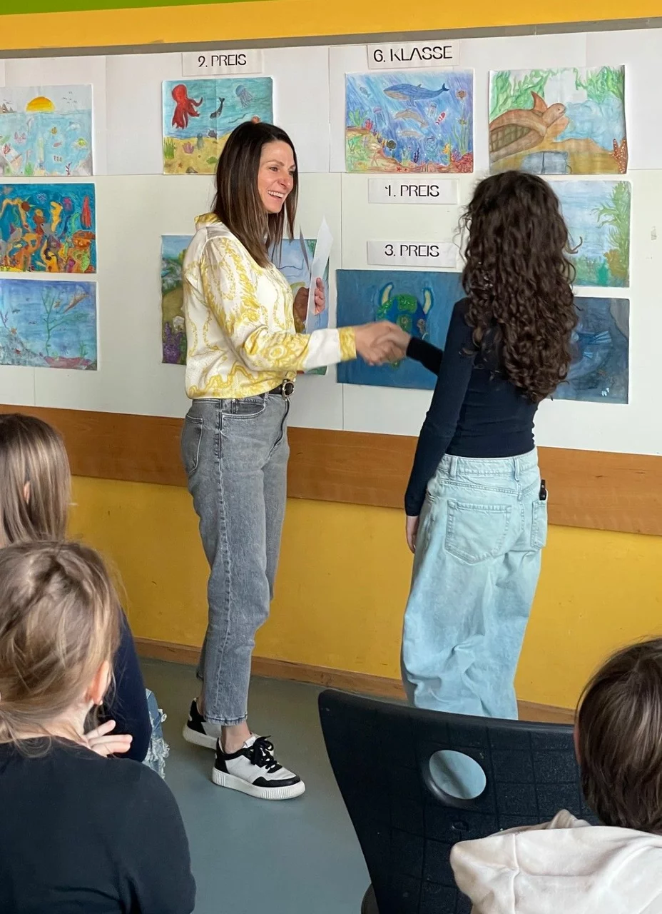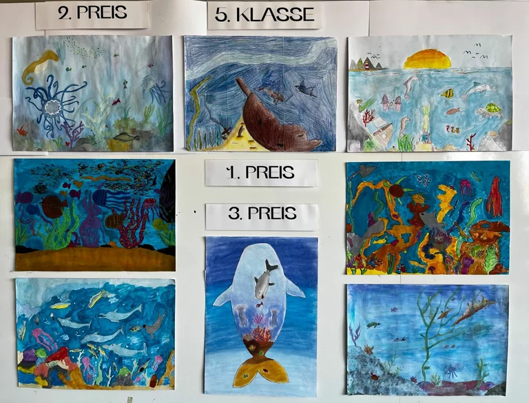 Die diesjährige Wettbewerbsrunde stand unter dem Motto „Meer entdecken“. Dabei beschäftigten sich die Schülerinnen und Schüler mit der faszinierenden Welt der Ozeane – einem Lebensraum von enormer Bedeutung für unseren Planeten. Gleichzeitig wurde auch auf die zunehmenden Herausforderungen aufmerksam gemacht, denen die Meere heute gegenüberstehen. Im Kunstunterricht erörterten die Schülerinnen und Schüler zusammen mit ihren Lehrkräften Barbara Hanauer, Tobias Wirth und Lucas Cabarth die verschiedenen Aspekte des Themas. Dabei ging es unter anderem um Umweltprobleme wie Plastikmüll in den Ozeanen, der zunehmend Küsten, Strände und Meeresräume verschmutzt und für zahlreiche Tiere eine große Gefahr darstellt. Neben diesen problematischen Entwicklungen wurde jedoch auch die enorme Bedeutung der Meere für das globale Ökosystem thematisiert. Ozeane sind Lebensraum für unzählige Tier- und Pflanzenarten, spielen eine wichtige Rolle bei der Regulierung des Klimas und sind zugleich wirtschaftlich von großer Bedeutung, etwa für Fischerei und Tourismus. Ausgehend von diesen Überlegungen entwickelten die Schülerinnen und Schüler eigene Bildideen zum Thema „Meer entdecken“. In ihren Arbeiten zeigten sie sowohl die Schönheit und Vielfalt der Unterwasserwelt als auch deren Gefährdung. Die künstlerischen Beiträge machten deutlich, wie wichtig es ist, dieses einzigartige Ökosystem zu schützen und verantwortungsvoll mit den Ressourcen unseres Planeten umzugehen.