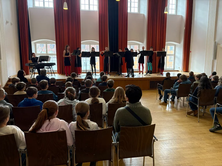 Vor gut zwei Wochen besuchten die Klassen 5e und 6e zusammen mit den Lehrkräften Frau Nicklas, Frau Bruckmüller und Herrn Kerscher ein Konzert des Flötenensembles „Musici Gaudentes“. Dieses stammt aus der traditionsreichen Prager Musikschule „Jan Hanus“, die seit ihrer Gründung im Jahr 1953 junge Talente in den Bereichen Musik, Tanz, bildende Kunst sowie Literatur und Theater fördert. Das Ensemble „Musici Gaudentes“, bestehend aus ausgewählten Schülerinnen und Schülern, ist ein besonderes Aushängeschild der Schule und hat sich in den letzten Jahren durch seine stilistische Vielfalt und hohe musikalische Qualität einen ausgezeichneten Ruf erarbeitet. In dem rund einstündigen Konzert im Thon-Dittmer-Palais in Regensburg zeigte die tschechische Gruppe ihr großes Repertoire, das von Barock- und Klassikwerken über romantische Musik bis hin zu zeitgenössischen Kompositionen und Bearbeitungen moderner Stücke reicht. Die Schülerinnen und Schüler der Klassen 5e und 6e – ein Teil davon spielt ja selbst ein Musikinstrument in der Bläserklasse – zeigten sich nach dem Konzert begeistert und waren deshalb fast einstimmig der Meinung, dass der Auftritt des Flötenensembles viel zu kurz gewesen sei. „Musici Gaudentes“ tritt regelmäßig bei Konzerten in Prag und in ganz Tschechien, aber auch im Ausland auf und wurde bereits mehrfach mit Preisen ausgezeichnet.