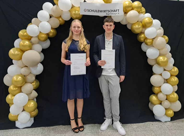 Feierlicher Höhepunkt war die Überreichung der Teilnahme-Zertifikate an die sichtbar stolzen Schülerinnen und Schüler durch die Vorstandschaft des Arbeitskreises SCHULEWIRTSCHAFT, vertreten durch Birgit Sandmann, Hans Schmidt, sowie Michael Knauer (Handwerkskammer Niederbayern-Oberpfalz).