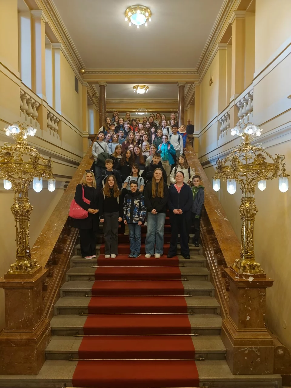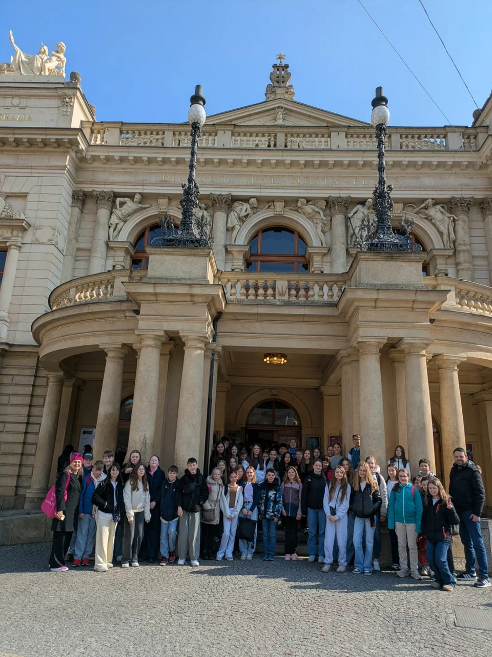 Am Mittwochmorgen machte sich die Gruppe mit dem Reisebus auf den Weg. Begleitet wurden sie von Frau Putz, die das Wahlfach Tschechisch unterrichtet, sowie von Herrn Braun, Frau Götz und Frau Werkmann. Im Theater besuchten die Reisenden die Aufführung „Špalíček“ („Das Liederbüchlein“). Das Werk des tschechischen Komponisten Bohuslav Martinů ist eine musikalische Bühnenproduktion, die verschiedene tschechische Volksmärchen, Bräuche und traditionelle Geschichten miteinander verbindet. In einzelnen, abwechslungsreichen Szenen werden bekannte Motive aus der tschechischen Folklore dargestellt – etwa Dorfleben, Hochzeitsbräuche oder Tänze. Musik, Gesang, Tanz und farbenfrohe Bühnenbilder greifen dabei traditionelle Melodien und Volkslieder auf und machen die kulturellen Wurzeln Böhmens auf der Bühne greifbar. Die Aufführung faszinierte durch ihre anschauliche Darstellung, die eingängigen Melodien und die kurzweilige Inszenierung. Auch ohne jedes sprachliche Detail zu verstehen, konnten die Jugendlichen die Handlung mühelos verfolgen und einen authentischen Eindruck von der tschechischen Kultur und Tradition gewinnen. Im Anschluss an den Theaterbesuch unternahm die Gruppe noch einen Spaziergang durch die historische Innenstadt von Pilsen. Dabei führte der Weg über den großen Platz der Republik mit der imposanten St.-Bartholomäus-Kathedrale, deren Turm zu den höchsten Kirchtürmen Tschechiens zählt. Die Teilnehmenden konnten die farbenfrohen Bürgerhäuser rund um den Platz bestaunen und die architektonisch beeindruckende Große Synagoge auf sich wirken lassen, die zu den größten in Europa gehört. Die Gebäude und Plätze vermittelten ein eindrucksvolles Bild von der Geschichte und Vielfalt der Stadt. Anschließend blieb noch etwas Zeit für einen kleinen Snack oder um in den umliegenden Geschäften zu stöbern.